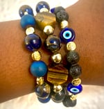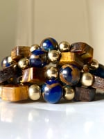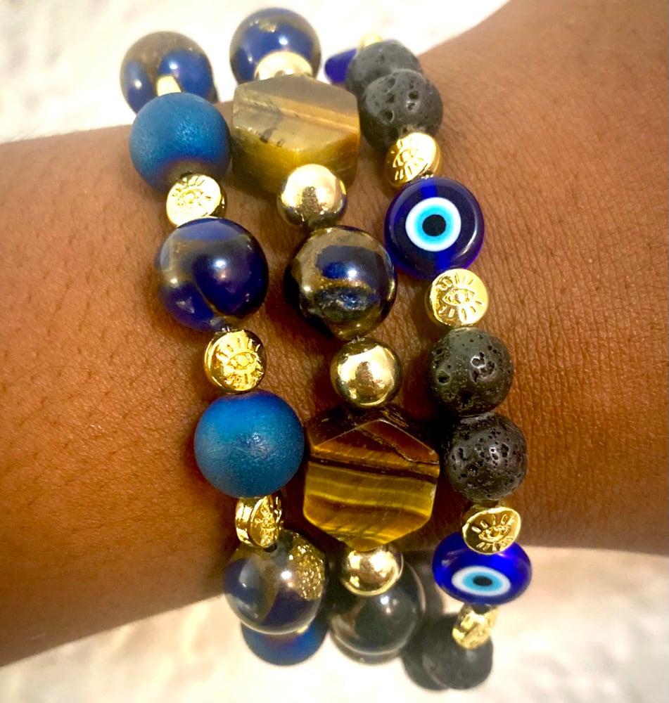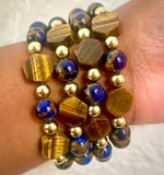Painted Mesa captures the desert’s natural artistry, blending imperial blue and brown impression jasper with warm agate and golden hexagonal tiger’s eye reminiscent of sunlit canyon walls. Each bead reflects the balance between earth and sky, mirroring the beauty of the Southwest’s layered horizons. This bracelet embodies calm strength and grounded elegance, perfect for those who carry the spirit of the desert wherever they go.